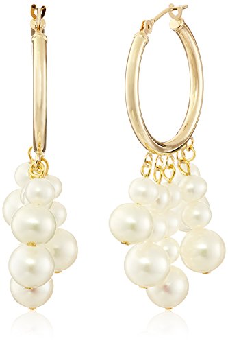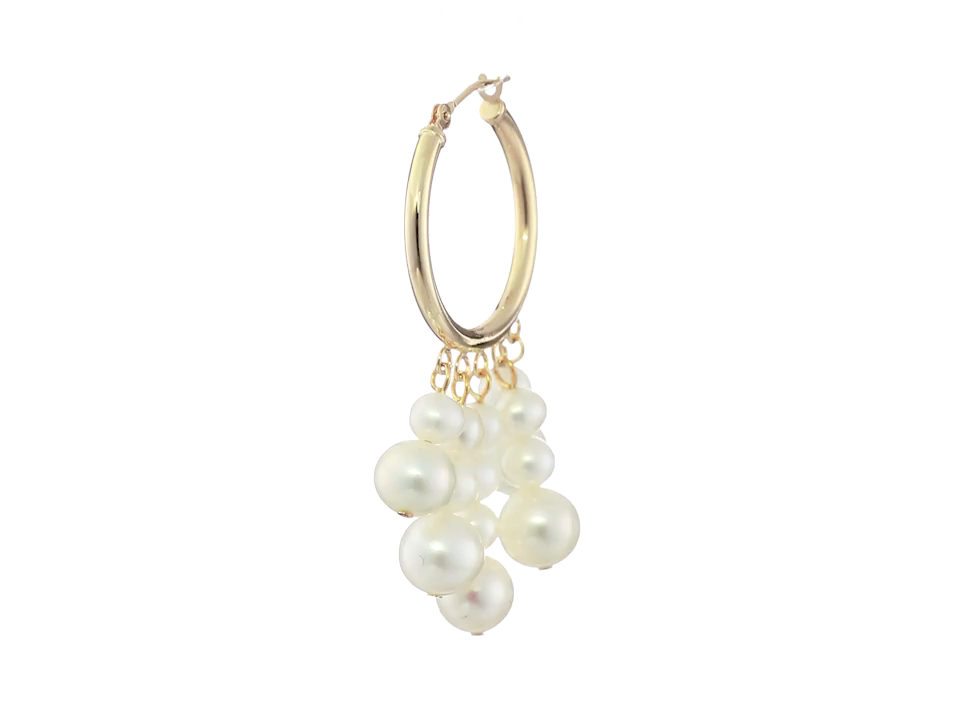 Small hoops in 14k yellow gold featuring cluster of semiround cultured freshwater pearls suspended beneath