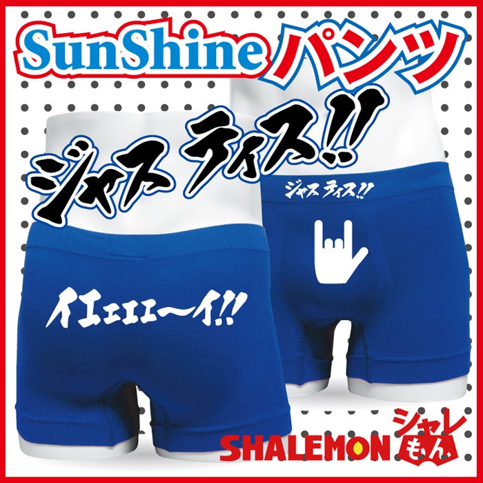 イエエエエーイ!!空前絶後のサンシャインパンツです。とにかく大きな声で、ジャスティス!!って言いながらプレゼントすると、きっと笑ってもらえると思います。あ、ちなみに、このパンツはパロディです。池崎さんや斎藤さんとは何の関係もございません。イエエエーイ!!