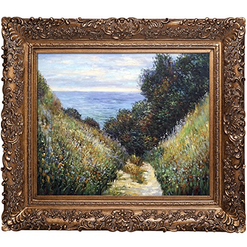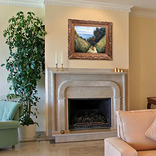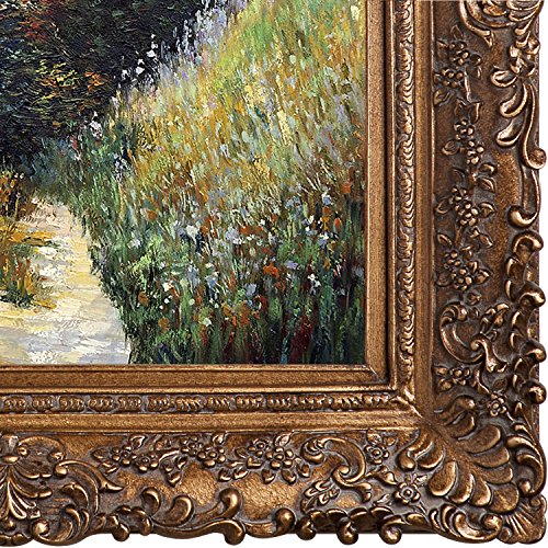Hand painted oil reproduction of a famous Monet painting, Chemin De La Cave Pour Ville. The original was done in 1882, today it has been carefully recreated detail-by-detail, color-by-color to near perfection. Why settle for a print when you can add sophistication to your rooms with a beautiful fine gallery reproduction oil painting? While Monet successfully captured life's reality in many of his works, his aim was to analyze the ever-changing nature of color and light. Known as the classic Impressionist, Monet cannot help but inspire deep admiration for his talent in those who view his work. This work of art has the same emotions and beauty as the original. Why not grace your home with this reproduced masterpiece? It is sure to bring many admirers. Frame Description: Burgeon Gold Frame - Organic Pattern Facade with Gold Finish.Feature