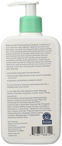 CeraVe foaming facial cleanser gently removes dirt, excess oil and dead skin cells to reveal a clean, fresh face. The non-irritating formula maintains a healthy moisture balance, never stripping the skin, while eliminating shiny, oily areas. Replenishing hyaluronic acid and ceramides produce a healthy skin barrier so your face feels comfortable without any tightness or dryness.Feature