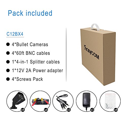 - Package includes: 4*camera, 4*BNC cable, 1*power adapter, 1*4-Way Power Splitter Cable