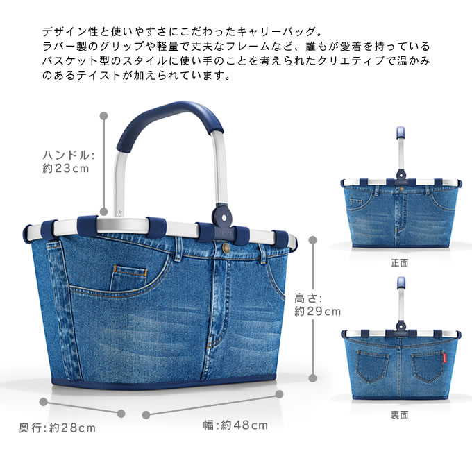 ポイントデニム生地を使ったユニークなデザイン。しっかりとした構造で、雑多な荷物も持ち運び易い。ショッピングやアウトドアなど、多用途に使える便利なバッグ。