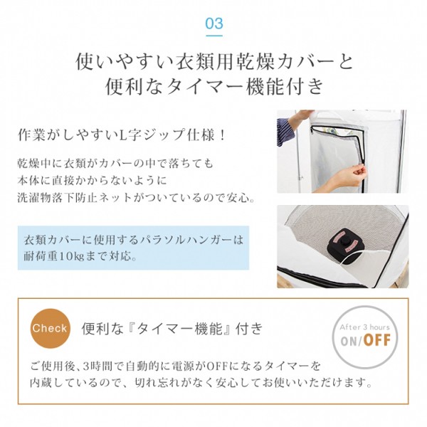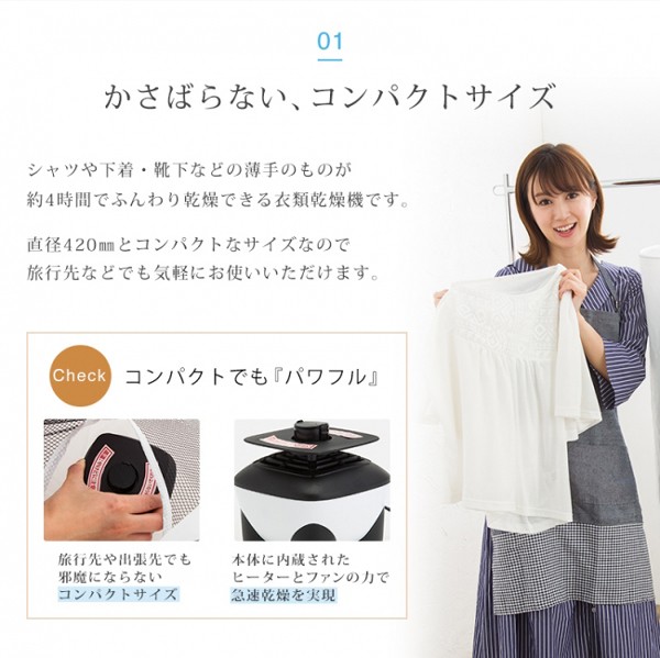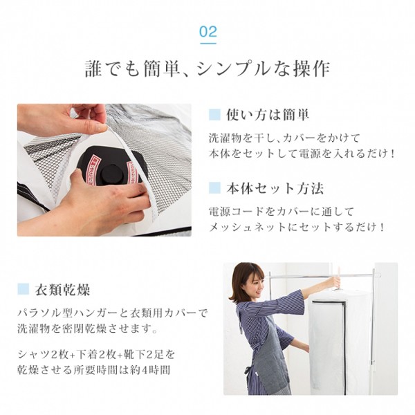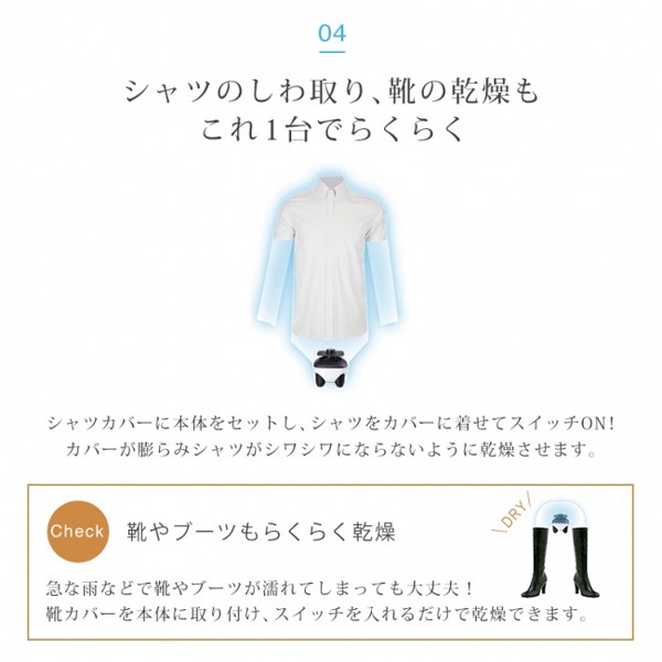 | 商品説明 | シャツや下着・靴下などの薄手の物が、約4時間でふんわり乾燥出来る衣類乾燥機です。 直径420mmと、コンパクトなサイズなので、旅行先などでも気軽にお使いいただけます。 ご使用後、3時間で自動的に電源がOFFになるタイマーを内蔵 また、急な雨などで靴やブーツが濡れてしまっても大丈夫! 靴カバーを本体に取り付け、スイッチを入れるだけで乾燥できます。 【商品詳細】 サイズ(約):本体/幅11×奥行11×高さ12cm 衣類カバー/42×42×80cm シャツカバー/160×55×93cm 靴カバー/33×33×83cm 本体重量(約):470g 電源:AC100V 50/60Hz 付属品:パワソル型ハンガー、洗濯バサミ(12個)、アタッチメント3種(衣類カバー・シャツ用・靴用)、取説兼保証書 |