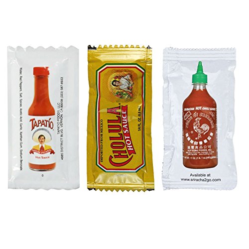 - You will receive (25) Tapatio, (25) Cholula, & (25) Sriracha Hot Sauce Packets - 75 total