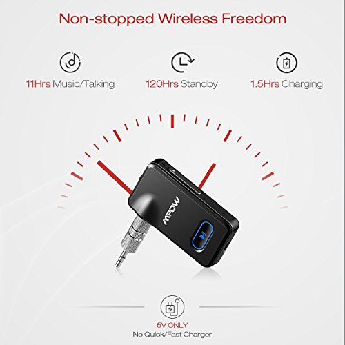 - CONSTANT AUDIO STREAMING MPOW: Built-in rechargeable battery provides up to 120Hrs standby time and 11Hrs audio feast after fully charged for only 1.5 hours. You can also continue to power your Bluetooth receive with additional charging cable.(Note: Charging Mpow with DC 5.0V & no quick charger.)