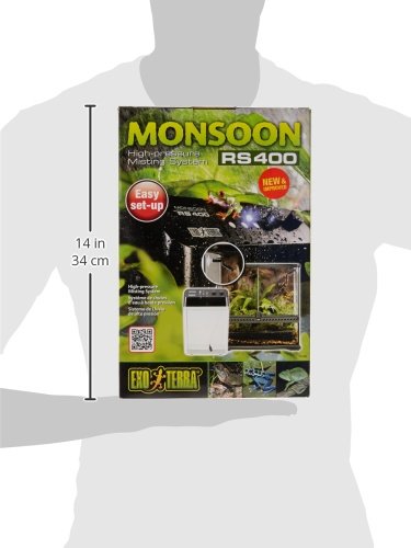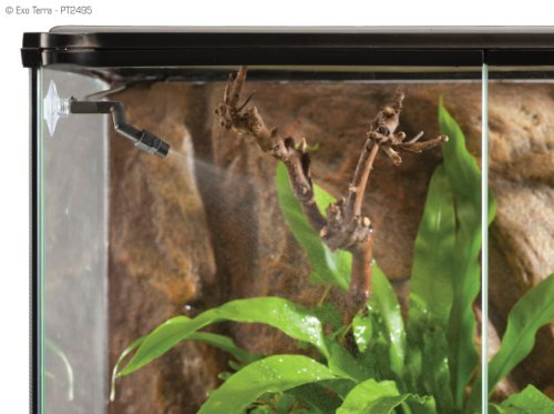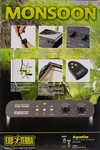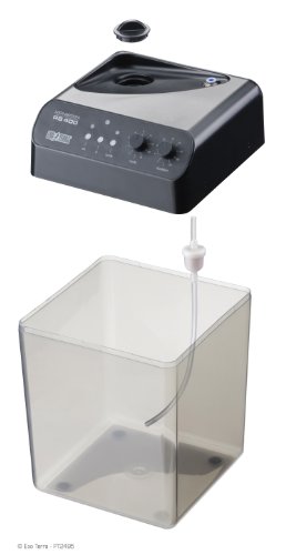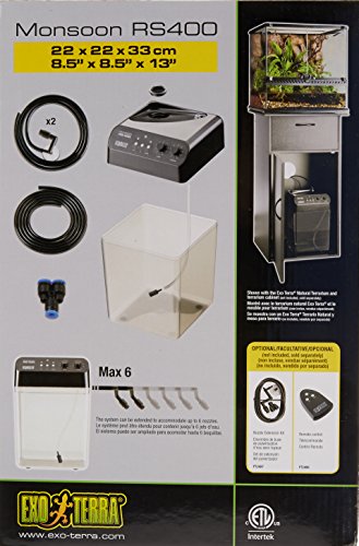 The Exo Terra Monsoon RS400, High Pressure Rainforest System, is a programmable rainfall system suitable for all types of terrariums and greenhouses. It helps maintain optimal humidity by generating precipitation at programmed intervals. The duration and frequency of precipitation can be easily adjusted depending on the type of animal or plant housed. Frequent rainfall helps stimulate breeding behavior, and is a necessity when housing live tropical plants such as Bromeliads, orchids, or mosses. The system can be programmed to rain multiple times per 24-hour cycle, for time periods ranging from one second to two hours. The timer allows for the system to rain on demand. The large one gallon reservoir ensures continuous operation for several days without the need for refilling, and the reservoir can be easily replenished without needing to uninstall the entire system. The Exo Terra Monsoon RS400 comes with two easy-to-install nozzles, but the system can be expanded to accommodate up to six nozzles, making it ideal for multiple terrariums. The rain produced by these specially designed nozzles is extremely fine, creating a mist-like effect in the terrarium or greenhouse, and the extra long tubing makes it possible to conceal the unit in a storage area or under the terrarium in a cabinet.Feature