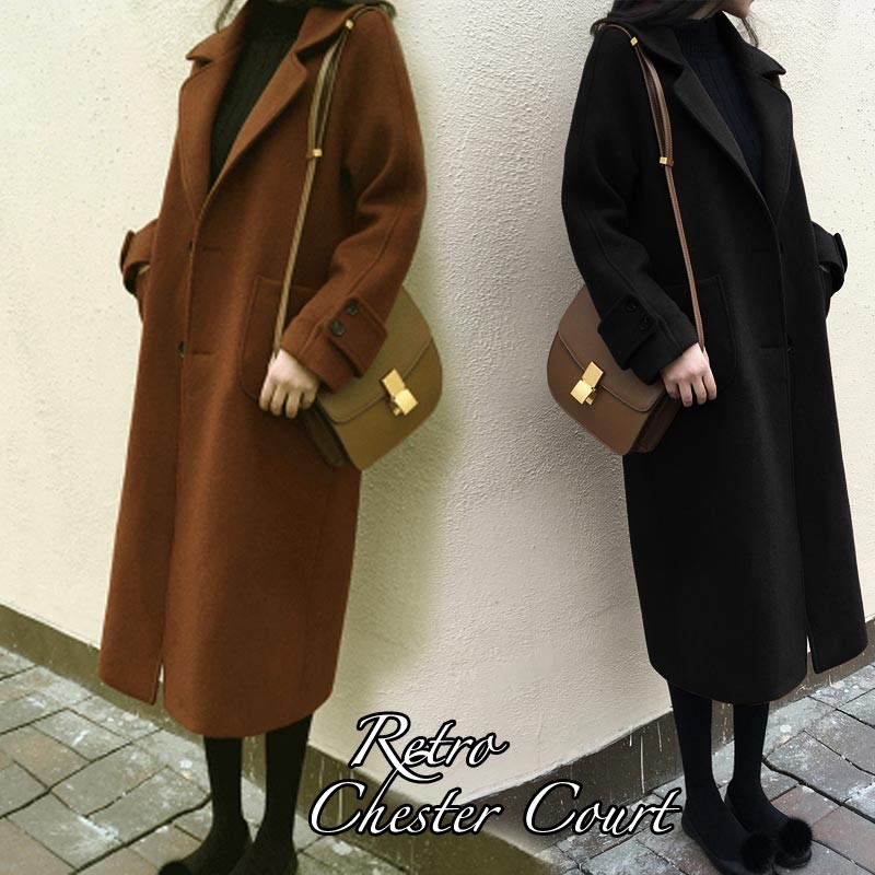 シングルブレスト・ルーズシルエットのロング丈チェスターコート。