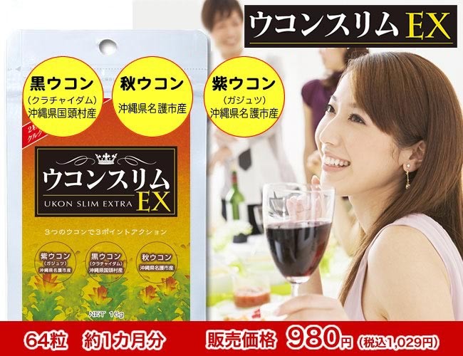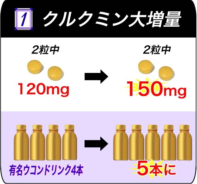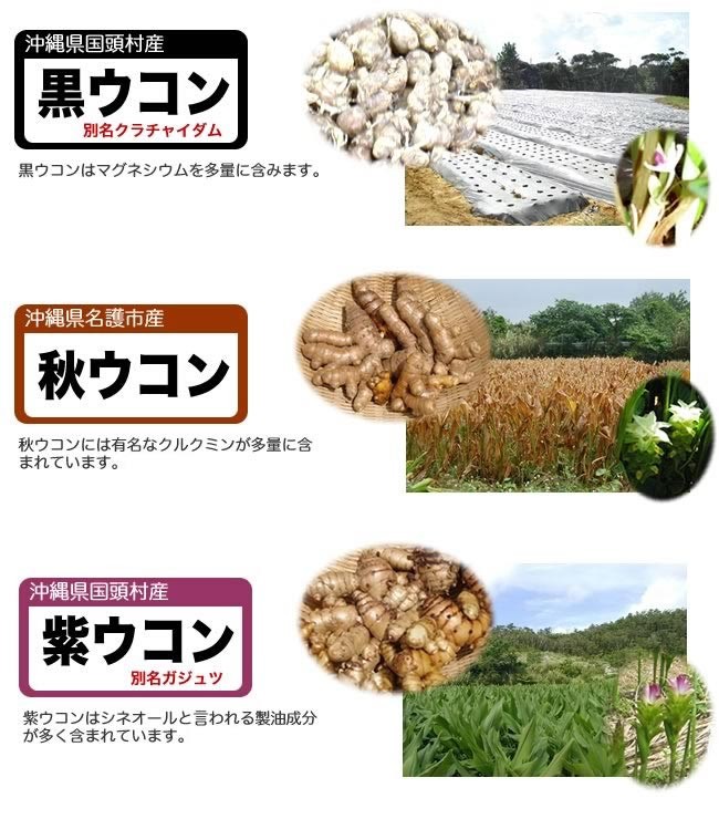 | 成分 | デキストリン、麦芽糖、ウコン抽出エキス(クルクミン含有)、秋ウコン粉末(沖縄産)、黒ウコン粉末(沖縄産)、紫ウコン粉末(沖縄産)、乳糖、結晶セルロース、グリセリンエステル、シェラック |