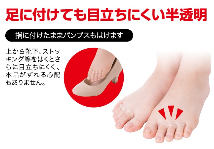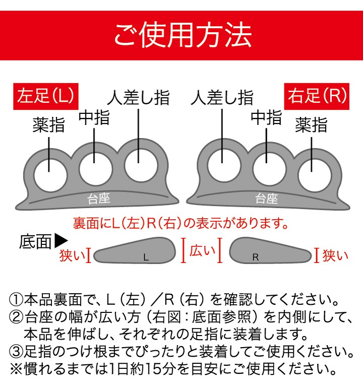 | ご使用方法 | 1.本品裏面で、L(左)/R(右)を確認してください。 2.台座の幅が広い方(化粧箱裏面参照)を内側にして、本品を伸ばし、それぞれの足指に装着します。 3.足指のつけ根までぴったりと装着してご使用ください。 ※慣れるまでは1日約15分を目安にご使用ください。 [お手入れ方法] ご使用後は、よく水洗いし、水切りをしてから風通しのよい日陰で乾燥させてから保管してください。 |