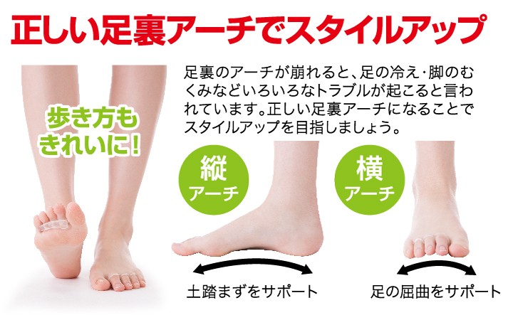 | ご使用上のご注意 | ●本品は医療機器ではありません。 ●ご使用中、またはご使用後に異常を感じた場合はすぐにご使用をおやめください。 ●最初は短時間の着用から開始して、徐々に着用時間を延ばすようにしてください。 ●本品が触れる部分に、傷・かぶれ・湿疹等がある場合はご使用しないでください。 ●本品のご使用時にはできるだけヒールが低く足を締め付けない、大きさに余裕のある靴をお履きください。 ●使用感には個人差があります。 ●血行障害・糖尿病の方、足裏に傷等がある方は、本品着用に関して事前に医師にご相談ください。 ●本品は、無理に引っ張ったり、傷が入るとちぎれるおそれがあります。 ●ご使用していくうちに変色することがありますが機能性に問題はありません。 ●乳幼児の手の届かない場所に保管してください。 ●火気のそばや高温多湿な場所、直射日光の当たる場所には保管しないでください。 |