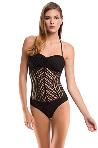 This stunning Sophia ladder crochet one piece bares and covers in all the right places. Mitered in front for a flattering and slimming look. Removable soft cups for added support
