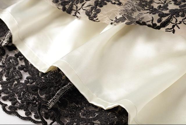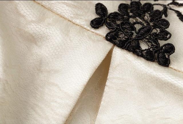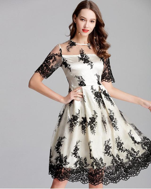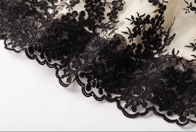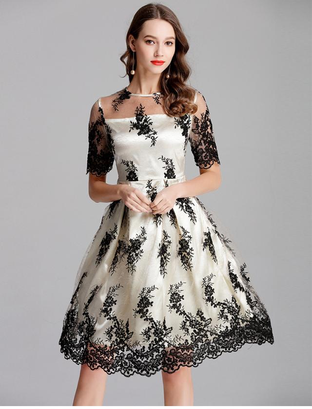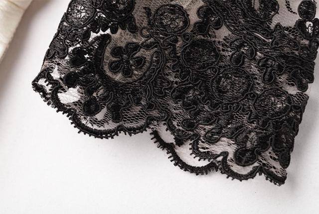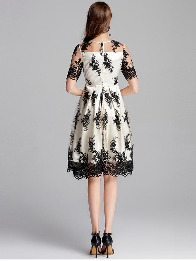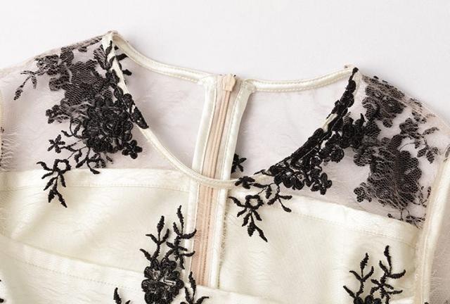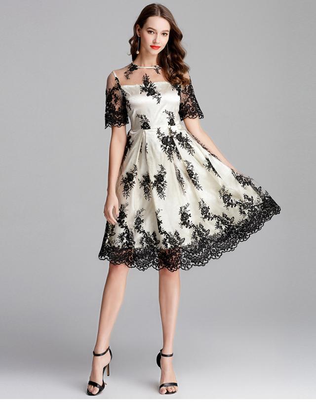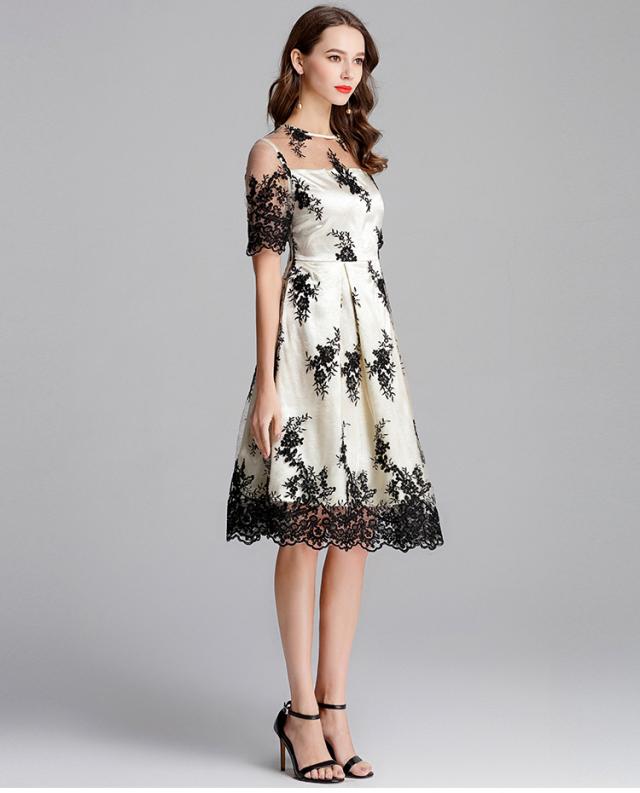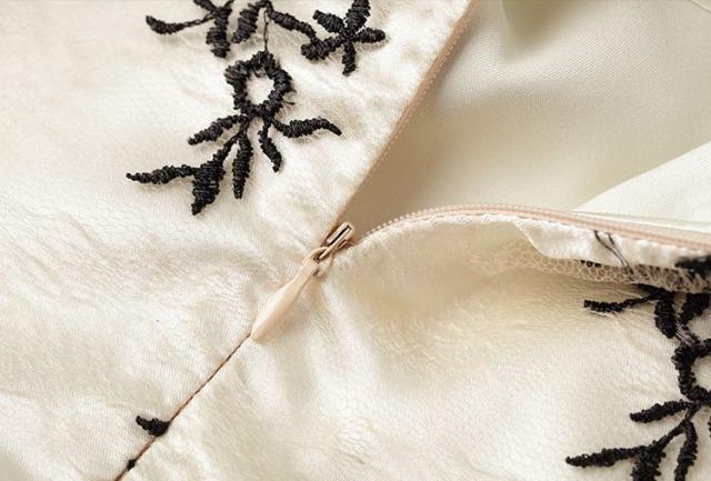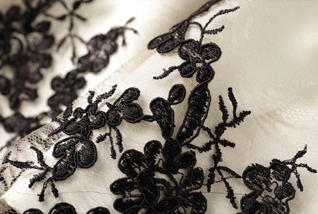 白いハリ感ある生地に黒い刺繍を施したモノトーンドレス。