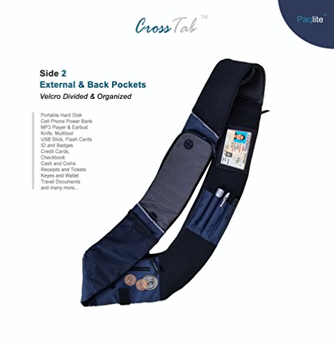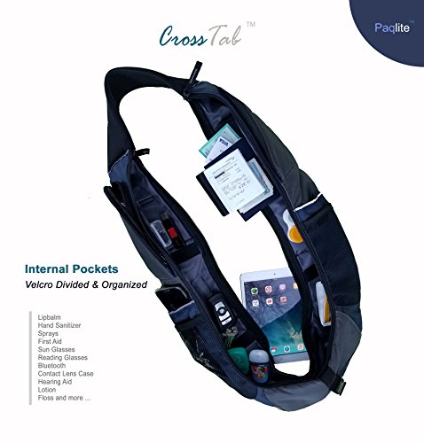 -. Brand : Paqlite -. Feature : MADE TO FIT - S, M, L, XL, XXL SIZES AVAILABLE AT PAQLITE COM TOO. SIZES GO WITH YOUR T-SHIRT SIZE. Even bigger Smartphones! 11 easy-to-reach sizable pockets.(including 5 internal padded pockets , 6 external pockets with 2 pockets with magnetic flap closures and 2 zippered pockets with media port and 2 mesh pockets for water bottle, glasses or receipts, 2 ID display pockets, 2 mesh pockets, pen pocket, 1 padded tablet pouch / STRONG 600D Nylon material paired with feather-light low-profile design allows hands-free operation across many activities while walking, traveling, shopping, sight seeing and more. / EQUIPPED Reflective tapes for safety at night on the shoulder piece, media port on the top zipper pocket. / ACCESSIBLE Two main panels each with full zippers on the side (edge) allow you to slide in objects such as mobile or wallet in addition to external or back pockets. The zippers can be parked anywhere along the panels to provide more or less access to the inner compartments based on usage, easy of access, security or other preferences. / COMFORTABLE Paqlite's Zero-Slide (TM) anti-slip shoulder pad to keep it secure and comfortable on your shoulder while having all your essentials with you. (Wallet, mobile, bluetooth, keys, pens, cash, receipts, tickets, passport, business cards. medicine, checkbook, lens case just to name a few). For additional sizes, color or other requests, please e mail Paqlite -. ProductGroup : Apparel -. ProductTypeName : APPAREL -. Title : CrossTab - TABLET Hands-Free Ultra-Light Personal Pack by Paqlite - Carryall CrossBody Shoulder bag