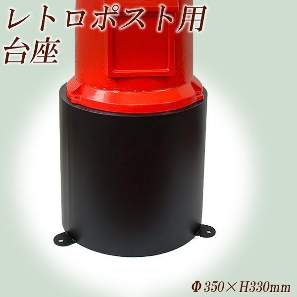 レトロポスト用の台座で、本体とポストを簡単に固定できます。盗難防止用に台座と地面を固定する為のアンカー穴付き。 製造国:中国 素材・材質:スチール(黒塗装) 商品サイズ:約Φ35×H33cm 重量:約5500g 付属品:六角ボルト(Φ8×20)×3本(ポストとの連結用)、取扱説明書 ※サプライヤー直送品 ご注文後2~3営業日後の出荷となります【商品名】KGY レトロポスト台座 H-330 鉄黒塗装