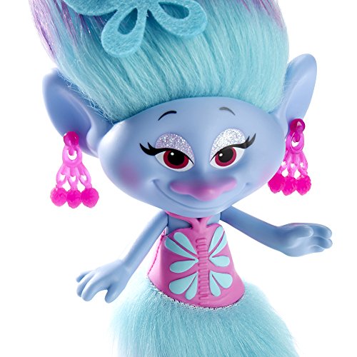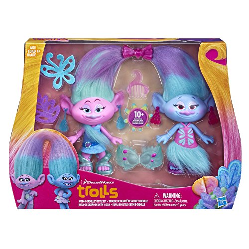 Linked together by the loop of brightly colored hair they share, DreamWorks Trolls Satin and Chenille are the most fashion-forward members in town! It's fun to dress these adorable twins in their glitzy, high-fashion outfits and accessories with this set. It comes with DreamWorks Trolls Satin and Chenille figures and removable fashions for them to wear, including earrings and shoes. Clip the ends of their colorful hair together with a barrette to join them, and style their hair with the Fuzzy Flair material. Get ready for dress-up fashion fun! DreamWorks Trolls copyright 2016 DreamWorks Animation LLC. All rights reserved. Hasbro and all related terms are trademarks of Hasbro.Feature