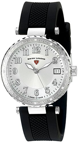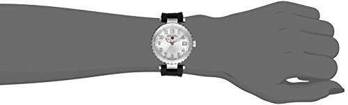Silver dial with silver tone and white hands, white Arabic numerals; luminous; stainless steel bezel encrusted with 12 white diamonds; screw-down crown; sapphitek crystal; stainless steel case; black silicone strap