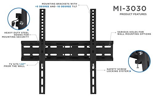 -. Feature : TILT TELEVISION WALL MOUNT. The MI-3030 is a tilting tv wall mount with 10 degrees of downward tilting action to reduce glare from room lighting. / UNIVERSAL FIT. This ultra slim, low profile TV bracket is virtually compatible with all 32" to 55" TVs, making it the perfect choice for any standard TV installation. / COMPATIBILITY. This mount is VESA compatible with 200x200, 300x200, 300x300, 400x200, 400x300, 400x400 (mm) patterns. It is safety-rated to carry up to 77 lbs, so it works for LED, LCD and plasma TVs. / SECURITY. Constructed with strength in mind, this mount features heavy-duty steel hooks and anti-lift saftey system to keep your TV securely mounted after installation. / EASY TO INSTALL. Quick and easy to install, the mounting kit comes complete with instructions and universal hardware.
