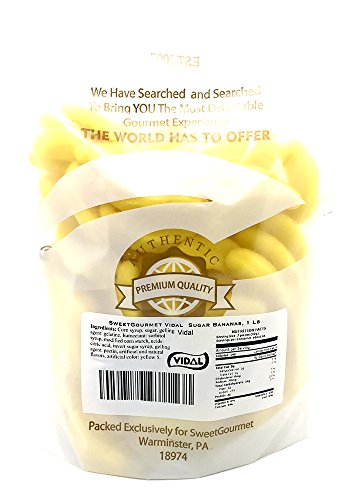 -. Binding : Grocery -. Brand : SweetGourmet -. Feature : Banana flavor / Perfect for any Candy Buffet Display! / Imported from Spain, Manufactured by Vidal / Net Wt.: Lb / These gummies will drive you bananas! Each soft and chewy gummi has a fun banana shape and is filled with banana flavor. These gummies make a great addition to parties and gift bags. -. IsAdultProduct : 0 -. Label : Vidal -. Manufacturer : Vidal -. PackageQuantity : 1 -. ProductGroup : Grocery -. ProductTypeName : GROCERY -. Publisher : Vidal -. Studio : Vidal -. Title : Vidal Sugar Bananas Gummy Candy bulk banana flavor gummy