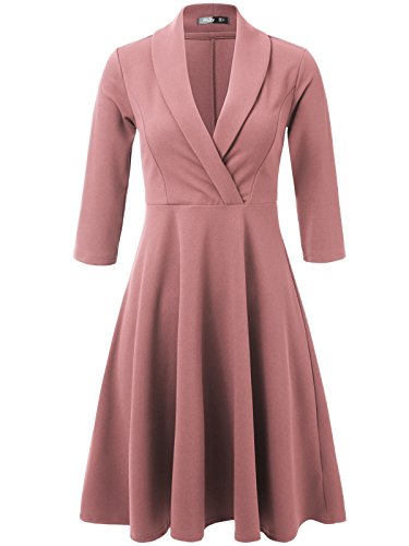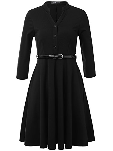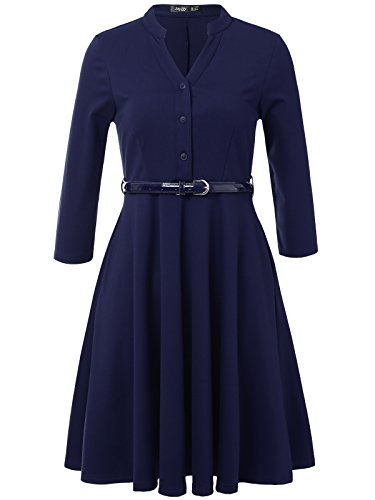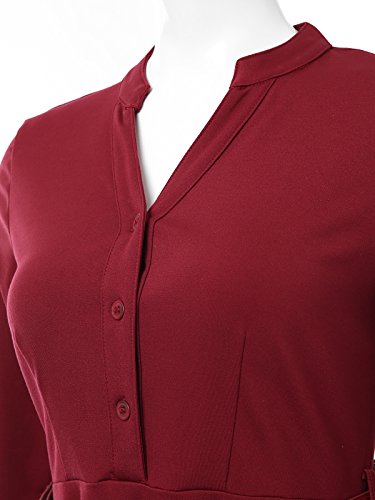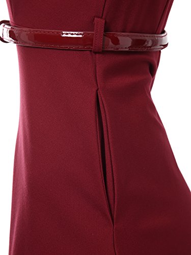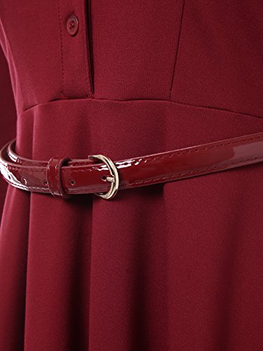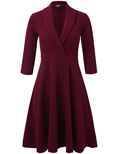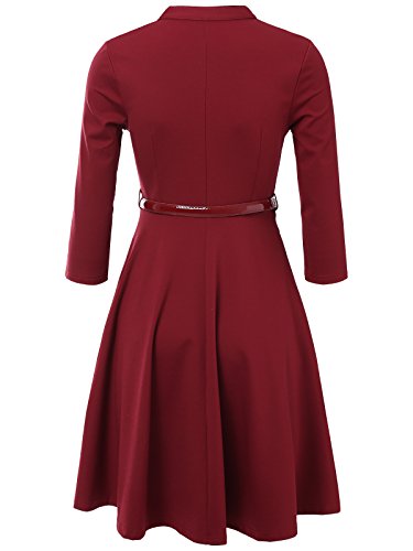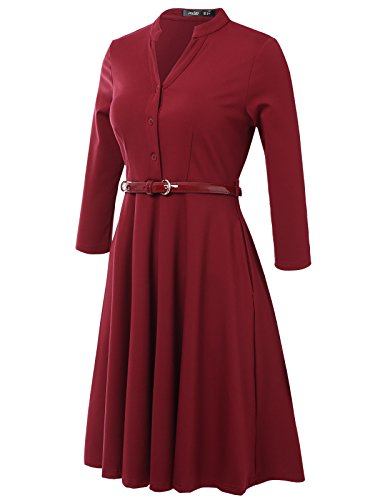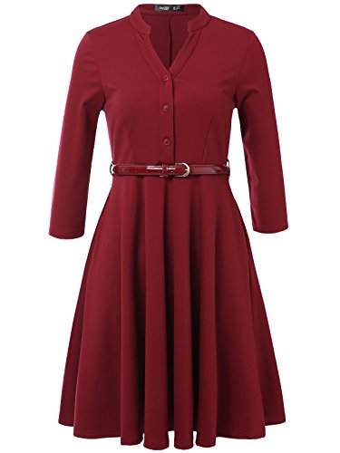 JayJay Women 3/4 Sleeve Fit and Flare V-Neck Cocktail Party Swing Dress with Belt and 2 Pockets,WINE,XL