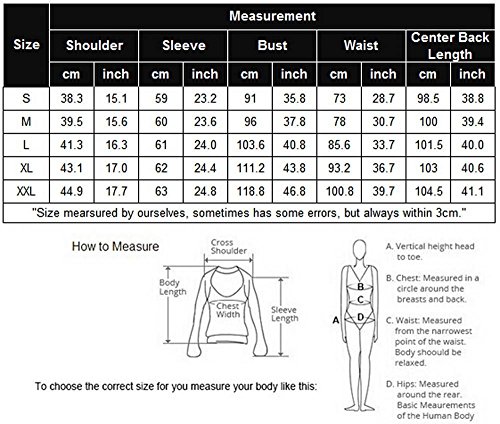 US Size M(8-10)---Shoulder---39.5cm/15.6";Sleeve---60cm/23.6";Bust---96cm/37.8";Waist---78cm/30.7";Length---100cm/39.4"
