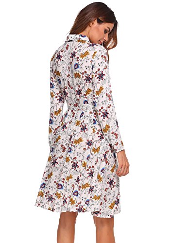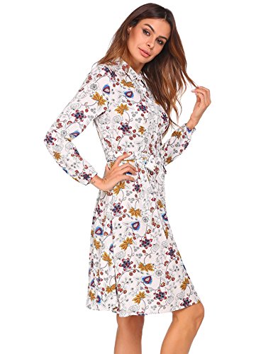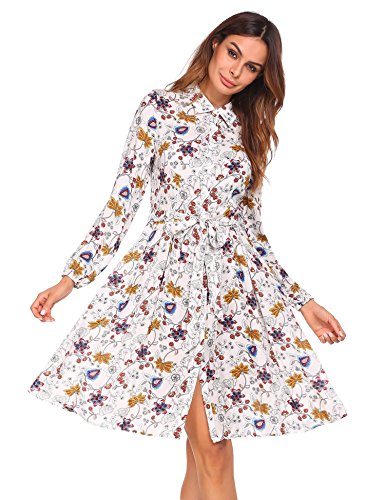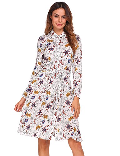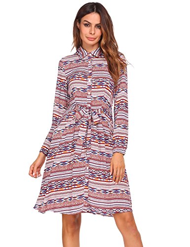 Women Long Sleeve Pleated Print Casual Shirt Dress with Belt
