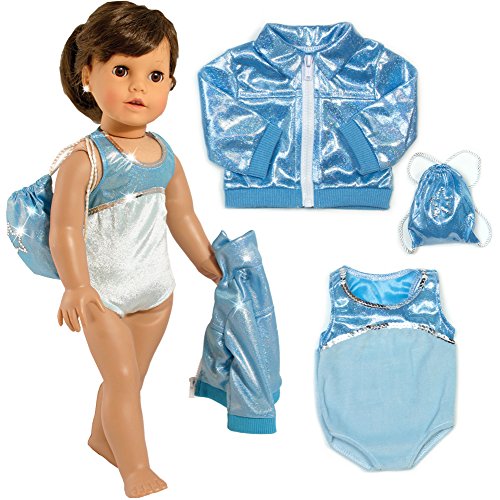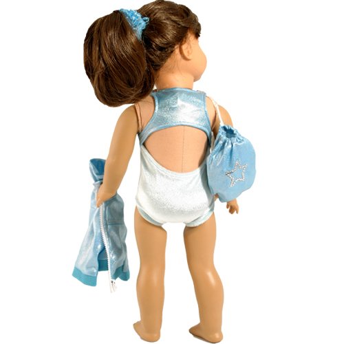 This adorable 3 piece set consists of a stylish aqua gymnastics leotard, a jacket, and coordinating gym bag! Doll not included. Hook & loops at top of leotard for easy dressing. Doll and Shoes Not Included. © 2013 Sophia's- All Rights Reserved. Not affiliated with American Girl®, Reg. Trademark of American Girl, LLC.