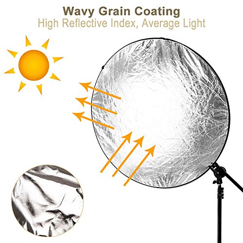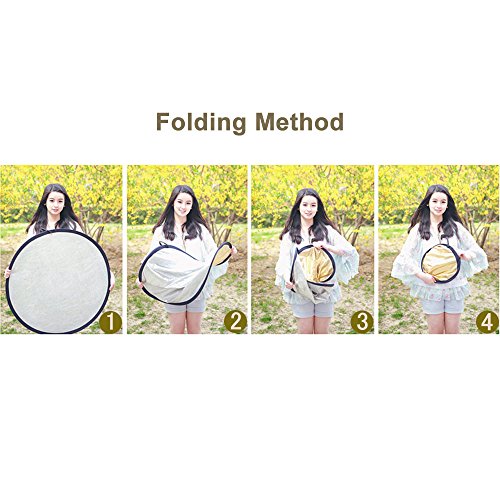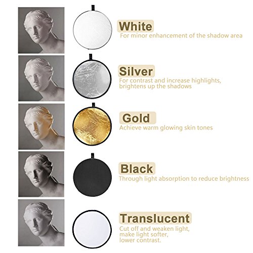 Function: Silver: For contrast and increase highlights, brightens up the shadows, not change the color of the available light. Gold: Achieve warm glowing skin tones. White: For minor enhancement of the shadow area, or can be used as a white backdop for headshots. It is not as bright as the silver side, so you can get closer to your subject. Black: Through light absorption to reduce brightness Translucent: Cut off and weaken light, make light softer, lower contrast. Applicable in the environment with intense light.