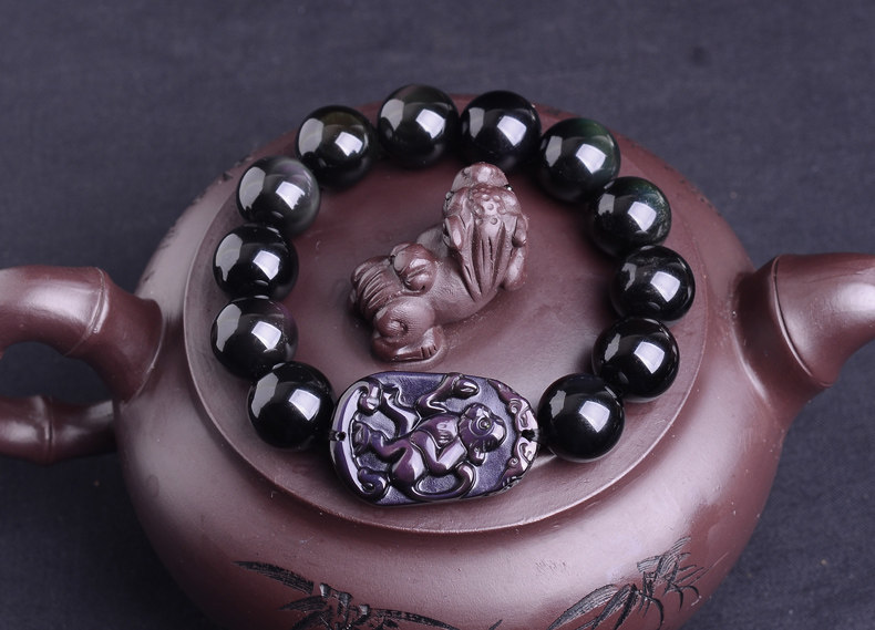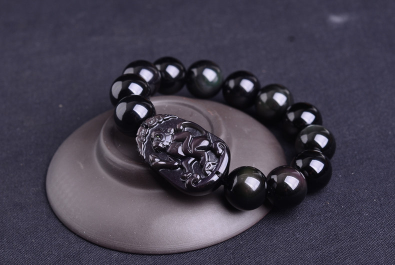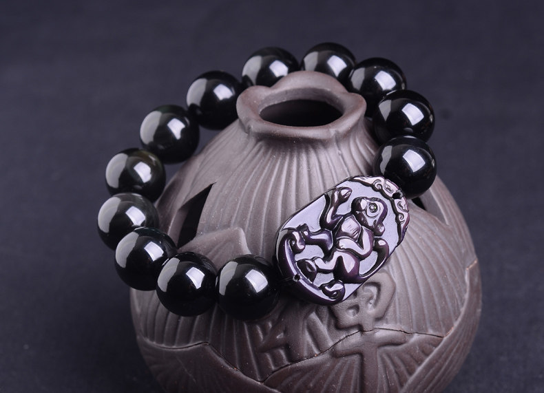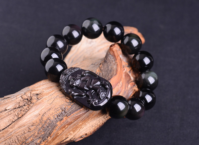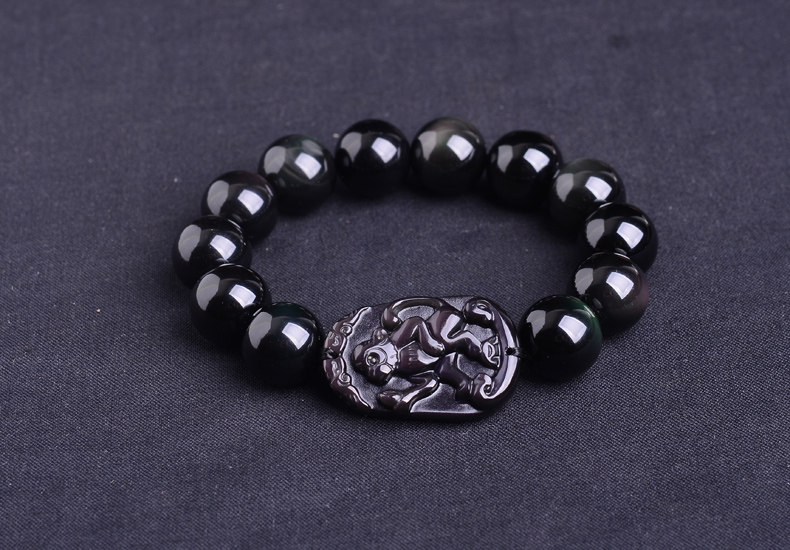 生肖猴吉祥物手链 本命年化太岁天然黑曜石男士手串