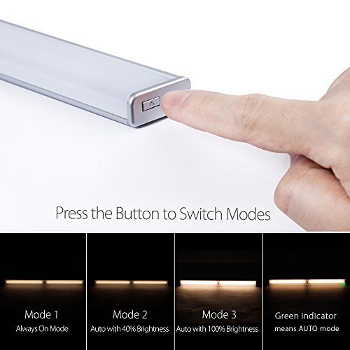 - 4 SETTING SWITCH: This Light Strip has Always On / Sensing (40% Brightness) / Sensing (100% Brightness) / Off, multi working modes meet your different occasions and needs. It's a perfect choice to be used in closet, kitchen cabinets, bathroom, stair, over-sink lighting, front porch, front door, garage, laundry room, bedroom, hallway, workshop, office, etc.