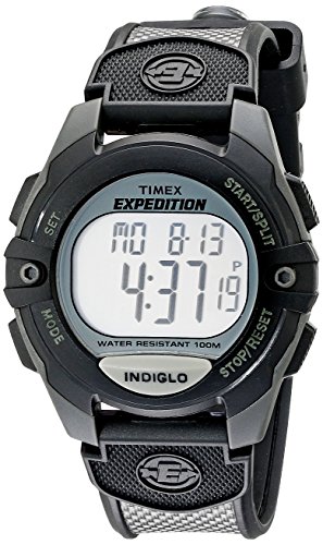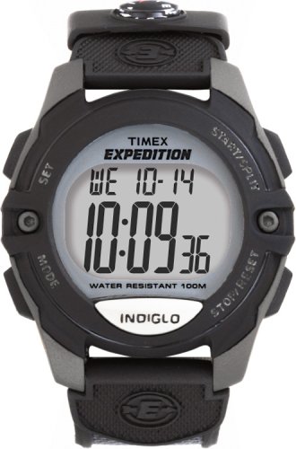 Amazon.com Product Description Designed for active, outdoor lifedesigns--as well as the rigors of harsh urban landscapes--the full-sized Timex T40941 Expedition digital watch adds a stylish yet rugged complement to your everyday wear. It features a large, round resin watch case with a dark gray top ring and a durable resin strap with buckle fastener). Timing features include a 100-hour chronograph with lap or split options, 99-lap counter, 24-hour countdown timer, and second time zone with date. It also offers three alarms with daily, weekday, and weekend options, and water resistance to 100 meters (330 feet). The Indiglo night-light uniformly lights the surface of the watch dial using patented blue electroluminescent lighting technology. It uses less battery power than most other watch illumination systems, enabling your watch battery to last longer. The Night Mode feature allows you to illuminate the Indiglo night-light for 3 seconds with any button press, regardless of the mode or function. 0