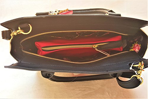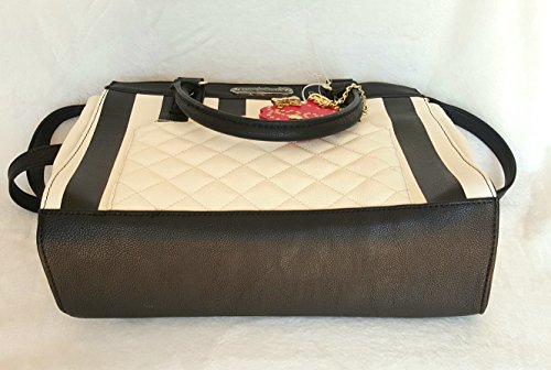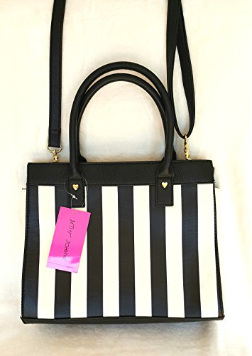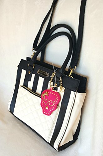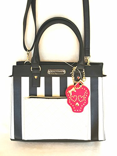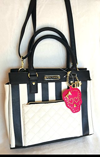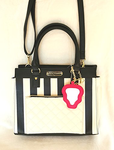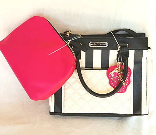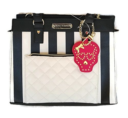 A bag with Fuchsia PU Leather Pouch. Bag has an overall Cream/Black Stripe PU leather Body. Front has a Quilted,Cream color,zippered pocket, Top Front has a Betsey Signature Name plate. A Detachable Fushia PU Leather Skull Charm w/ Gold tone studded on one side and Mirror on the other side. Dual Short handles have approx 5.5" drop. Longer Black Single Adjustable Strap has approx 23" drop Bag Measures: Length:14" x Height: 10.5" x Depth: 4.5" approx. Pouch Measures: 10" L x 7.5"H x 3" D. Both Bag & Pouch has Printed Floral Polyester inner lining.