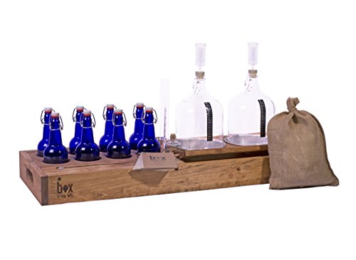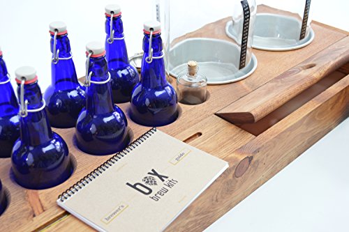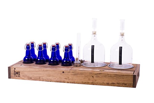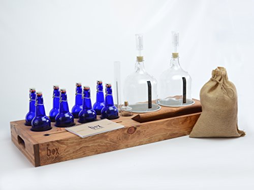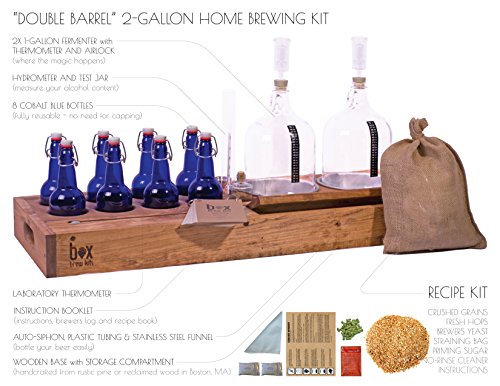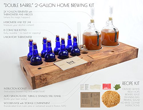 Studio : Box Brew Kits Publisher : Box Brew Kits Product Description Brewing embodies an ancient balance of art and science. From selecting your favorite recipe to drinking the immensely satisfying result, this beautiful handcrafted homebrewing kit contains everything you need to brew delicious craft beer and stir up some great conversation, too. Brew two batches of beer at a time in our 2-gallon kit, measuring 37" long and 14" wide. This model includes 8 reusable cobalt blue flip-top bottles to bottle your beer, no caps required. Parts included: - Box Brew Kits 2-gallon base, handcrafted from rustic pine - 2 1-gallon glass fermenters - 8 reusable cobalt blue flip-top bottles (no need for capping) - Triple-scale hydrometer with glass test jar (and stand), for measuring alcohol content - Auto-siphon, for quickly and easily transferring your beer between vessels - 2" Stainless Steel Funnel - Drilled rubber stopper - 3-piece plastic airlock - Laboratory Thermometer - Miscellaneous glass jar (for priming sugar, sanitizer, etc.) - 4' length of 3/8" tubing, for siphoning your beer - Recipe Book with over 25 recipes to choose from - Brewers' Log - Full set of instructions Recipe packs are NOT included and are available for separate purchase. 0