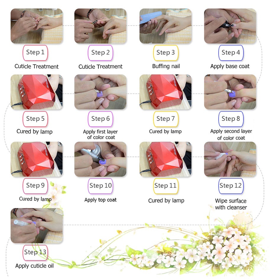 4、ライトでカラージェルを硬化する時、ジェルの厚さ、トップコートとベースコートのタイプや個人により、必要な硬化時間が異なります。