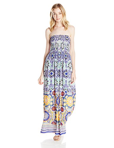 Angie Women's Blue Printed Smocked Bodice Maxi Dress
