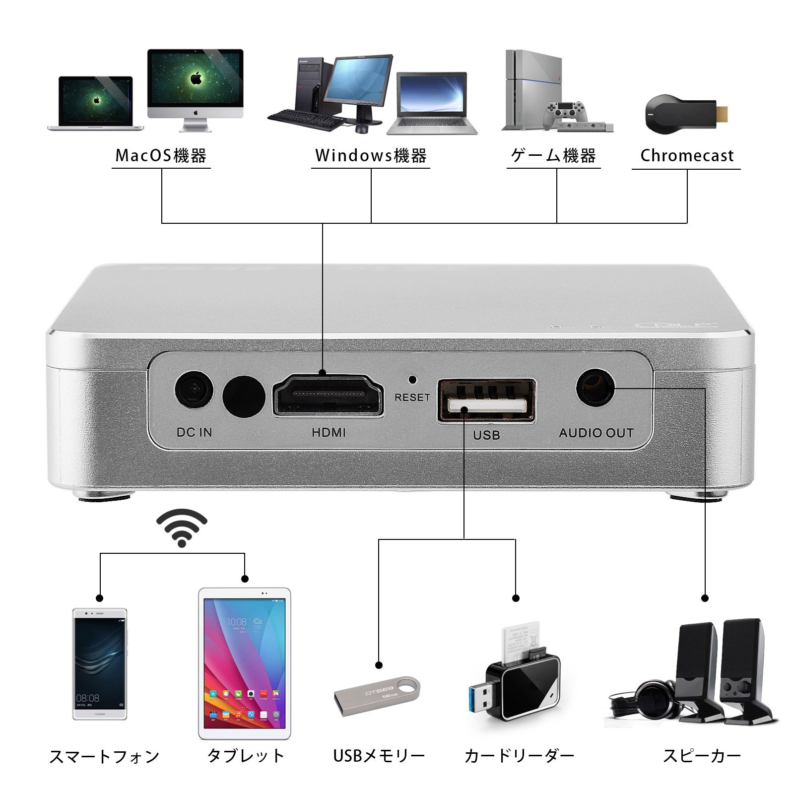 This product is LED projection & small mobile projector, It can connect with smartphone, personal computer, video equipment / game machine etc wired and wirelessly, and can project images.