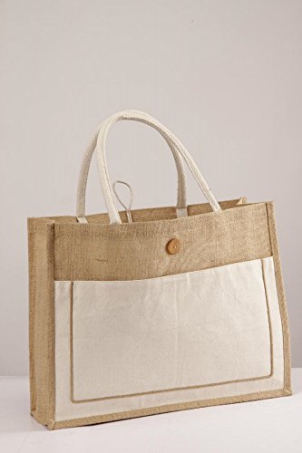 Jute and Cotton bag with Button closure and front pocket cotton webbed handles Color Natural Size -18"W x14"H x 5.5"Gusset - Carrygreen Bags