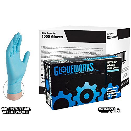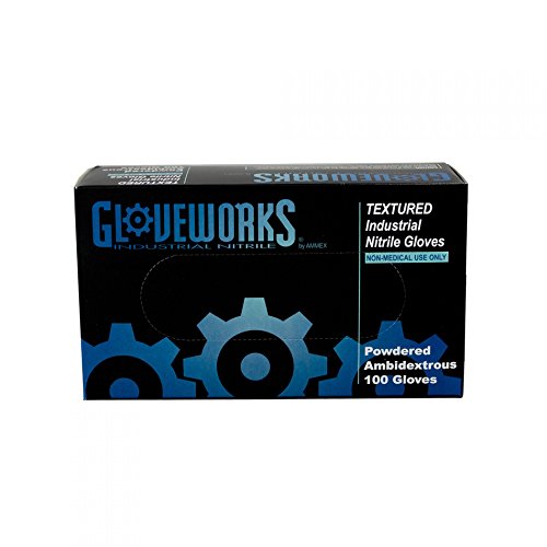 The Ammex Gloveworks industrial-grade nitrile, powdered glove has a palm thickness of 4 mils and a finger thickness of 5 mils and is 9.5" long from the tip of the middle finger to the edge of the beaded wrist cuff, which is 3 mils thick. Nitrile provides better elasticity than vinyl, better puncture resistance than latex or vinyl, better abrasion resistance than chloroprene, and reduces the likelihood of allergic reaction. This glove is suitable for non-medical uses, such as the automotive industry or other heavy-duty applications. It is textured on the fingertips, fingers, and palm for improved grip. A polymer coating has been applied to the interior of the glove, as well as cornstarch, reducing surface friction and allowing it to be put on more easily than uncoated, powder-free gloves, particularly in wet environments. This ambidextrous glove is blue.