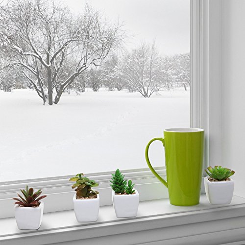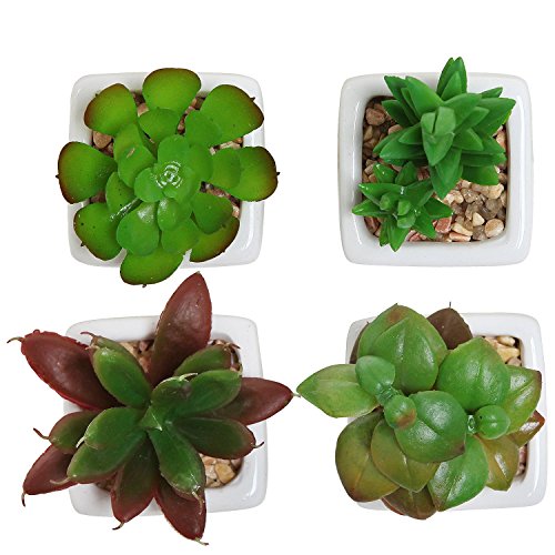 Set of 4 Small Green Plastic Artificial Succulent Plants in Mini Modern White Ceramic Planter Pots