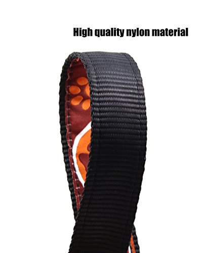 Features: Single sided covered nylon strap with paw print pattern Adjustable strap length Sturdy 0