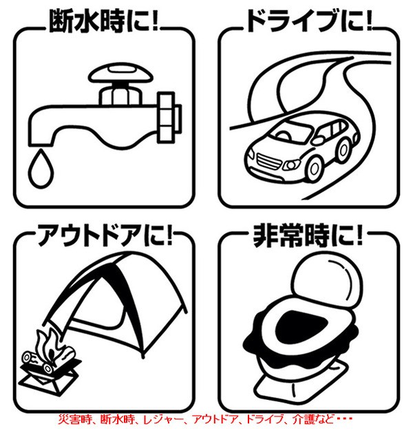 非常時の必需品!・・・水を使わない非常用トイレです。非常時にライフラインがストップ!・・・でも、便はストップしてくれません。このセルレットは、そんな非常時でもトイレができる強力な味方です。使い方は簡単!洋式トイレ、ポータブルトイレなどに汚物袋をセットして、排泄後に凝固剤を袋のまま入れるだけ。袋は自然に溶けて、わずか数十秒で水分を吸収、固化します。消臭性に優れた強力な活性炭入りだから、悪臭の発生も抑えます。使用後は水分モレの心配もありません。衛生的で簡単!備えあればうれいなしです。レジャー、アウトドア、ドライブ、介護などでも活躍します。