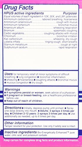 For natural relief of shortness of breath, tightness in chest, wheezing, upper respiratory or bronchial congestion and cough, mucus congestion, symptoms of emphysema, wheezing and pain in chest. Safe and natural homeopathic formulas. No alcohol, dairy, glutens, sugar or yeast. Taste free, odor free, pure water base.