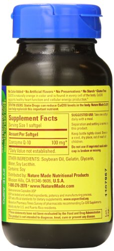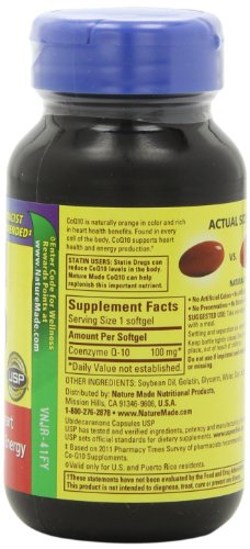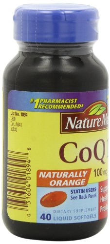 -. Binding : Health and Beauty -. Brand : Nature Made -. EAN : 0031604018948 -. Feature : 40 liquid soft gels / Recommended for heart health / Boosts body energy production / Works with Vitamin E to fight free radicals / No artificial flavors -. IsAdultProduct : 0 -. Label : Nature Made -. LegalDisclaimer : This product is not intended to diagnose, treat, cure , or prevent any disease -. Manufacturer : Nature Made -. Model : 1894 -. MPN : 1894 -. NumberOfItems : 1 -. PackageQuantity : 1 -. PartNumber : 1894 -. ProductGroup : Health and Beauty -. ProductTypeName : HEALTH_PERSONAL_CARE -. Publisher : Nature Made -. Size : 40 Count -. Studio : Nature Made -. Title : Nature Made CoQ10 100mg, 40 Liquid Softgels -. UPC : 031604018948
