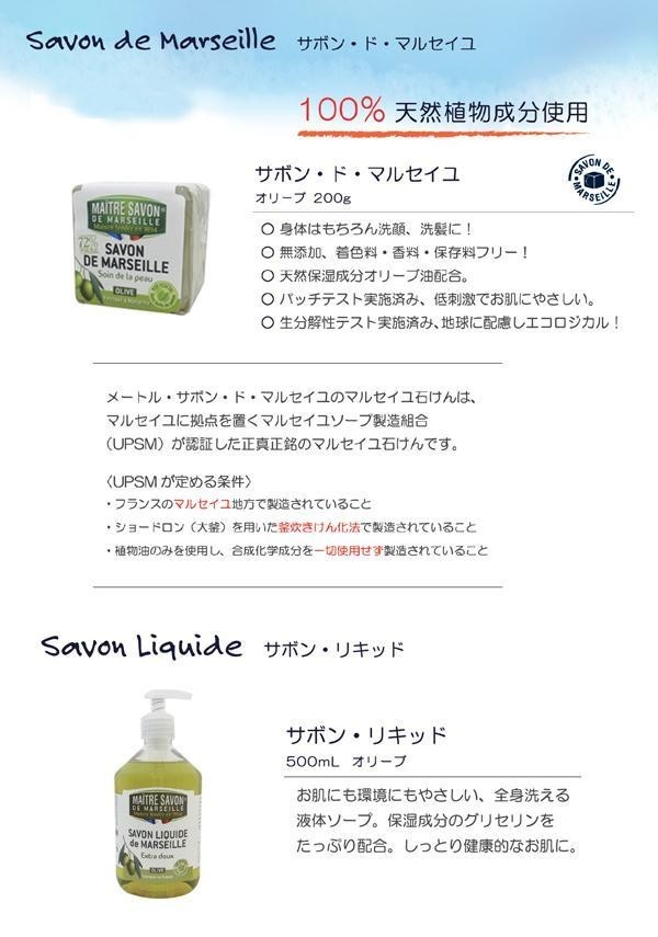 | セット内容 | サボン・ド・マルセイユ(オリーブ)200g×3 サボン・リキッド(ハンド&ボディソープ)オリーブ500ml×1 |