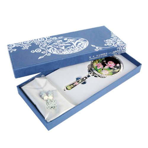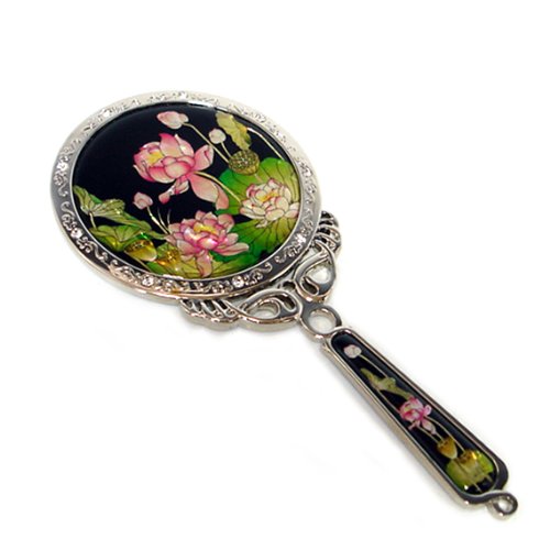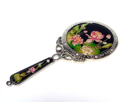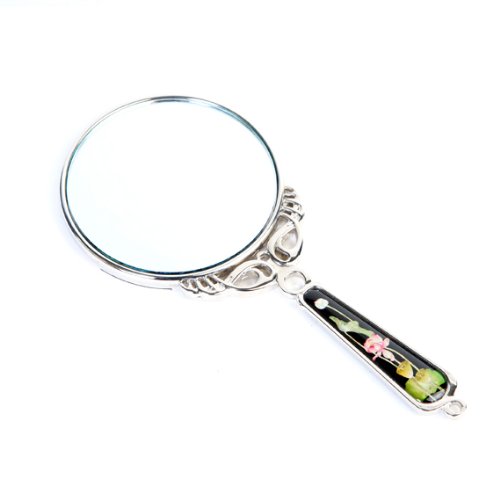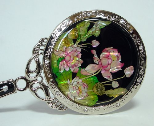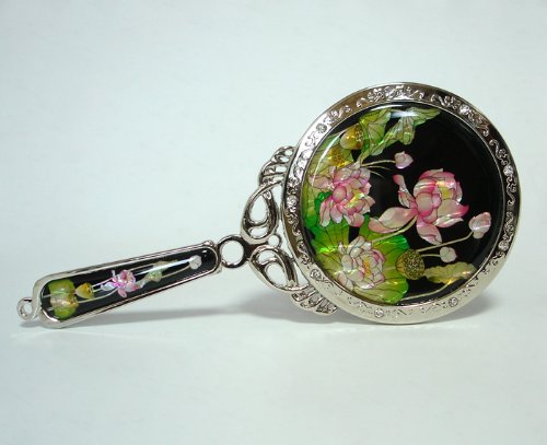 Mother of Pearl Princess Pink Lotus Flower Design Round Metal Cosmetic Makeup Hand Mirror, 6.7 Ounce