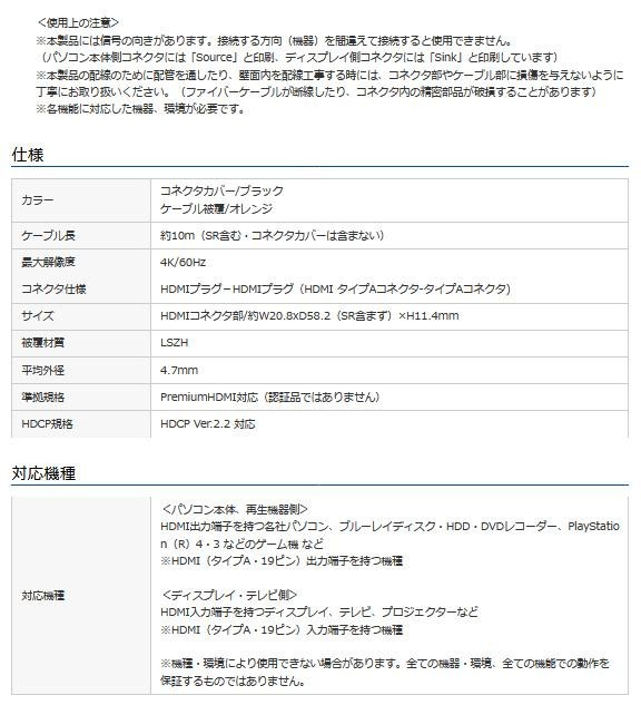 4K/60Hz(PremiumHDMI)、18Gbpsの高速伝送に対応した光ファイバーHDMIケーブルです。明暗差を活かした立体感のある映像を伝送することができるHDRに対応しています。サビにも強く、経年変化による信号劣化の心配が少ない金メッキ処理のコネクタシェルとピン(コンタクト)を使用しています。 |