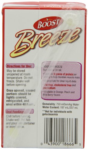 ReleaseDate : 2009-03-17 Studio : Resource Publisher : Resource Binding : Health and Beauty Product Description BOOST BREEZE Clear Liquid Nutritional Drink provides 250 calories and 9 grams of high quality protein in each 8 fl oz serving. When a convenient source of additional protein and calories in a fruit-flavored drink is the goal, BOOST BREEZE fits the bill. 0