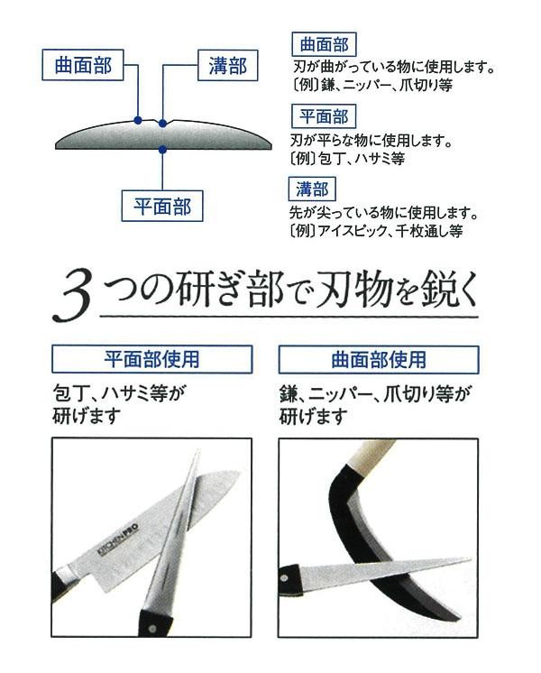刃物を使う前にサッとひと研ぎ。ダイヤモンド粒子を配合した砥石で、切れる刃物に研ぎ上げます。曲面部・平面部・溝部の3つの研ぎ部で様々な種類の刃物を簡単に研ぐ事が出来ます!! |