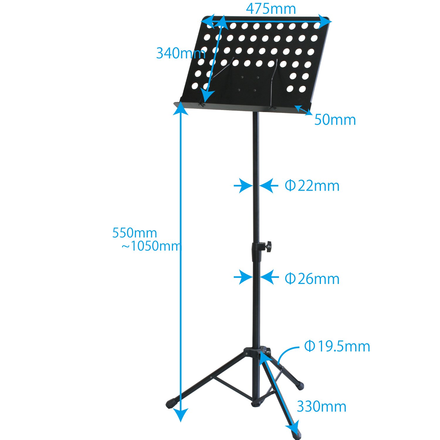 The musical score section can be adjusted with vertical size of 340 mm horizontal 475 mm depth 50 mm, height adjustable from 550 to 1050 mm, you can use it conveniently for both chorus and performances.