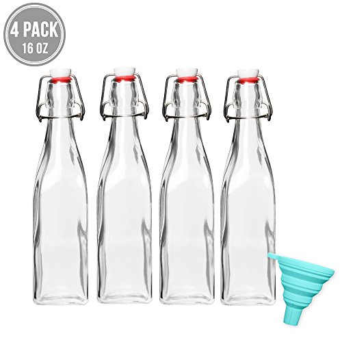 EXTRA-STRONG SEAL - The Flip Cap tops are made with sturdy steel and thick rubber gaskets to provide a super strong, leak proof seal, which helps preserve your homemade beverages, carbonation, and fermentation. 16 ounce square bottles. Clear.