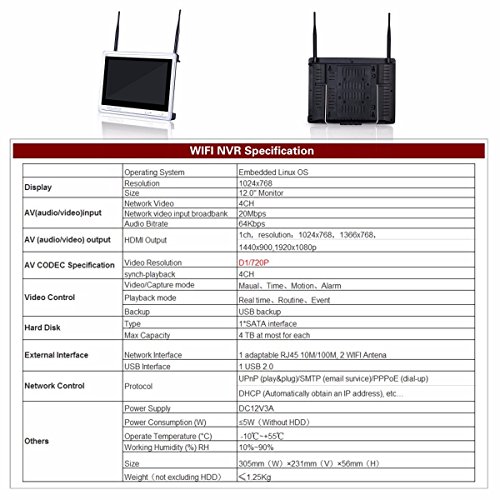 ★ Easy to use the 12inch monitor NVR kits: Plug and play, the only thing you need to do is connect the antennas with the cameras, then POWER the cameras amd NVR, all the cameras will auto pair with NVR, you will get the images on the 12inch monitor within minute.True Plug and Play. You don't have to do the other mess things. A sample video about how to install this system: https://youtu.be/EQxeK9grNOA